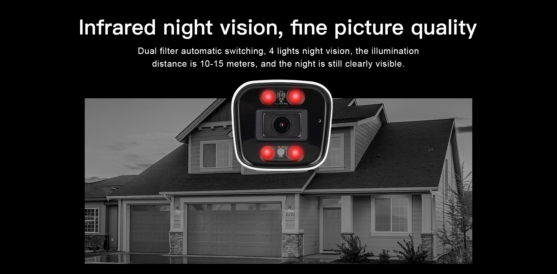 | Night Vision | IR-CUT with auto-switching, 4pcs 850nm IR LED lights, Irradiation distance 5~10 m | |