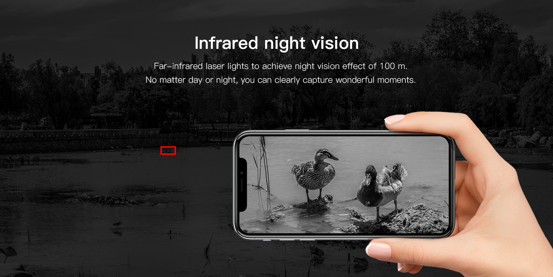 | Night vision | IR-CUT with auto-switching,6 pcs 850nm IR LED lights+3 pcs laser lights; Irradiation distance: 100~200 m | |