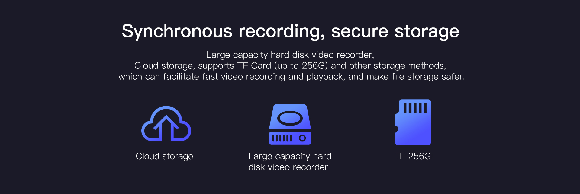 | Storage | Storage functions | Supports T-Flash card(max supports 256GB); Cloud storage; NVR;NAS |